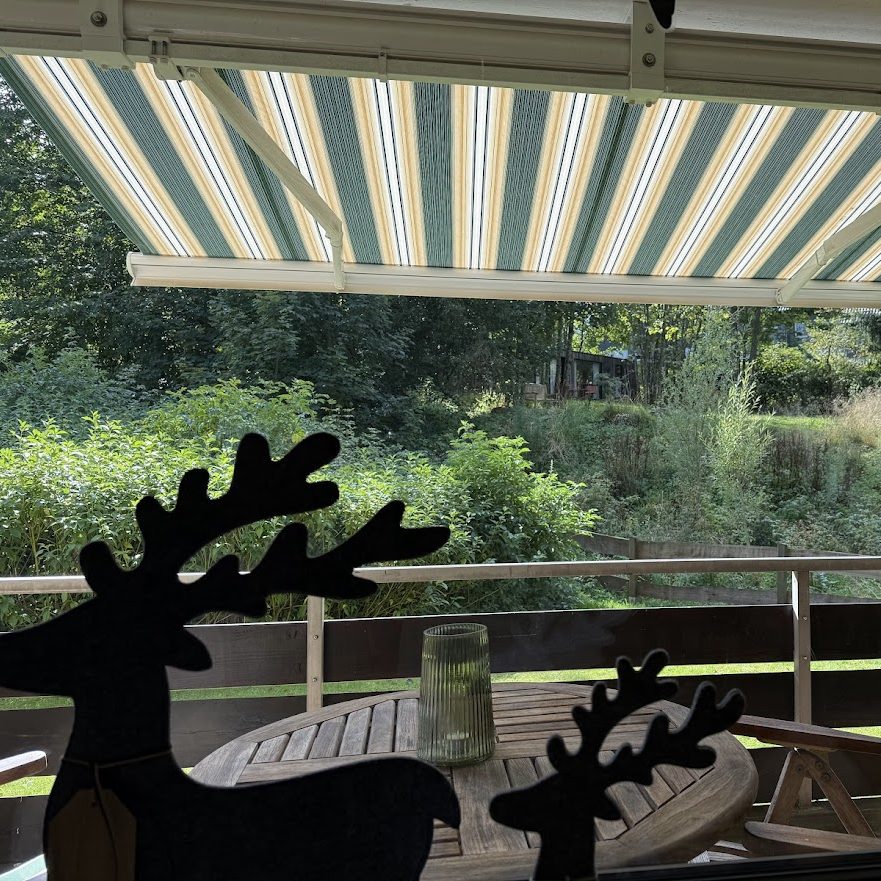 Der überdachte Balkon ist mit einer elektrischen Markise ausgestattet.