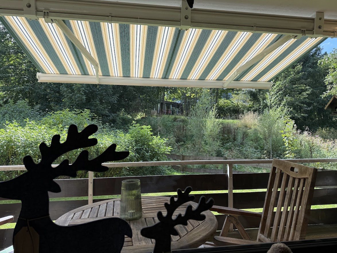 Der überdachte Balkon ist mit einer elektrischen Markise ausgestattet.