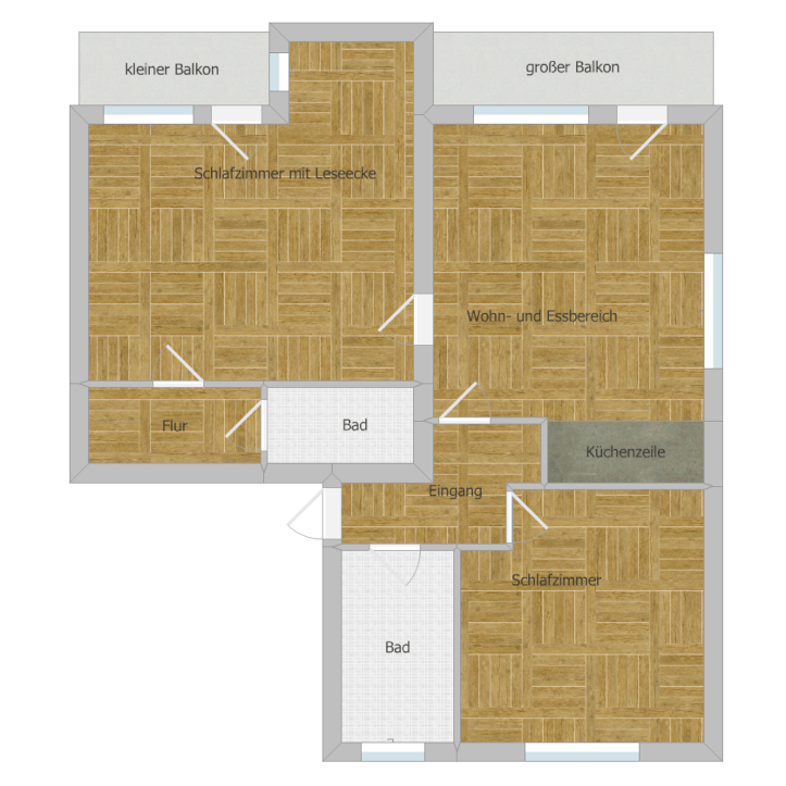 - Alle Räume sind mit Parkettfußboden ausgestattet. Die Bäder sind gefliest.